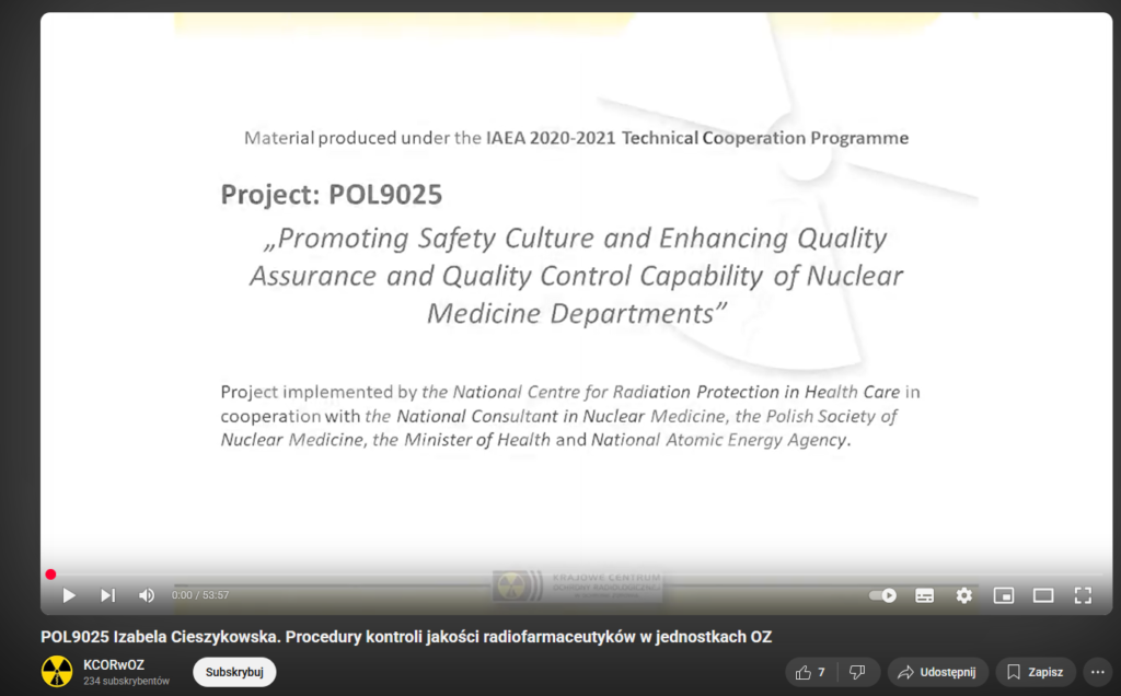 Opis: Wykład zrealizowany we współpracy z Międzynarodową Agencją Energii Atomowej w ramach projektu IAEA TC POL9025 „Kultura bezpiecznego stosowania promieniowania jonizującego oraz doskonalenie systemu QA/QC w jednostkach medycyny nuklearnej w Polsce” i wygłoszony podczas Kongresu Polskiego Towarzystwa Medycyny Nuklearnej w dniu 20 maja 2021 r.
